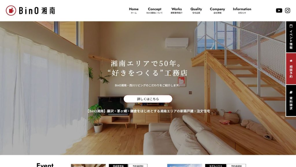 BinO湘南は、スキップフロアや平屋など、独自の構造を持つ規格住宅「BinO」「FREEQ」シリーズを展開しています。