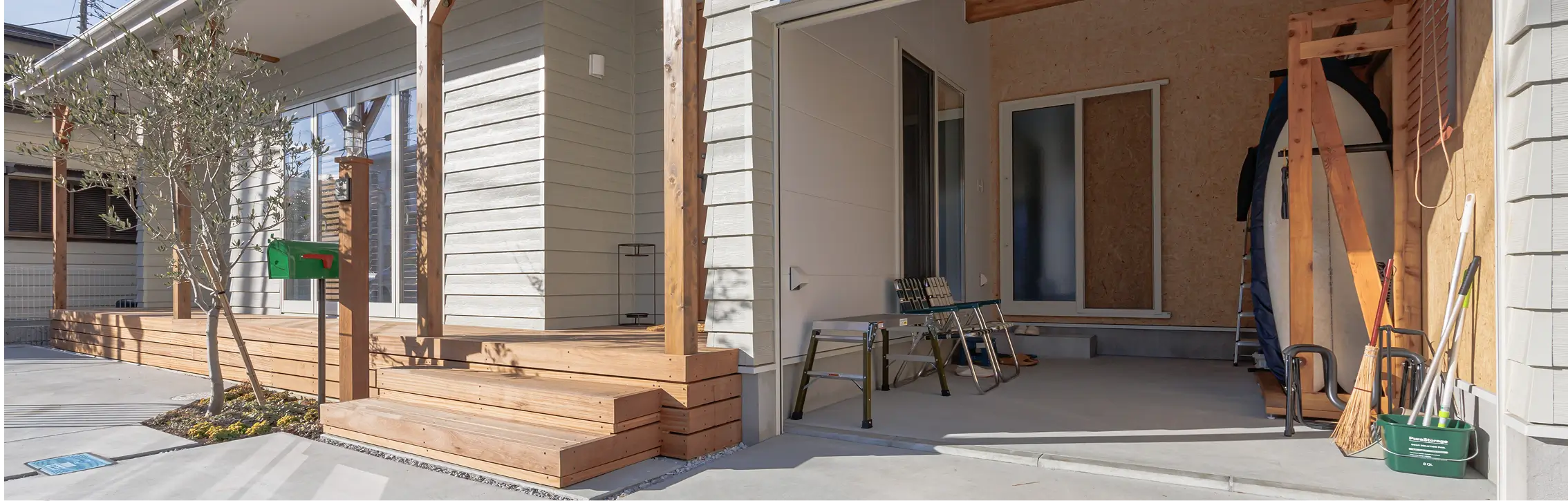 平家風に高さを調整したというファサードバランス。ガレージまで軒を連続させたカバードポーチは、サーフボードを持った仲間たちが気軽に集える、半屋外の心地よい空間。ゆったりと腰掛け、海上がりの時間を共有できます。木製の温かみが感じられ、自然と会話が生まれる、コミュニティの場となっていることでしょう。外構はご自身でやりたかったという想いを叶える、自由度の高いスペース。これから続く日常をどのようなグリーンやアイテムが加わり、この家らしい個性が生まれ彩られていくのか、楽しみが広がります。